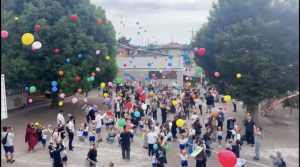 最後は「天まであがれ!」です。「1・2・3」の合図でお家の方・お友だち、そして先生方みんなでお空に向かって風船を飛ばしました。空高くあがっていく風船を見上げながら「どこまで飛んでいくのかなあ」「宇宙までとんでいきそうだね」と風船の行方をお家の方と一緒に笑顔で話す様子にほっこり。