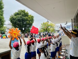 開会式後は、「応援合戦」です!!応援団長に続き、「フレー!フレー!わかば!!」と園庭にお友だちの大きな声が響き渡りました。次は、お家の方とお友だちの対戦。お家の方も大きな声で頑張りました!!
