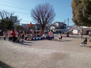 冬休みに入った若葉幼稚園。登園したお友だち全員、朝の戸外遊びで三角帽子を自分で装飾し、「パーティーって何するのかな」と楽しみにする姿が見られました。