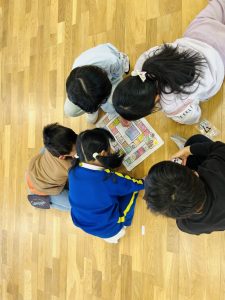 一年生お手製の「がっこうすごろく」や「がっこうクイズ」に興味津々。一年生のお兄さん・お姉さんの優しさに安心して遊ぶ年長組さん。小学校進学に期待が高まった様子です。