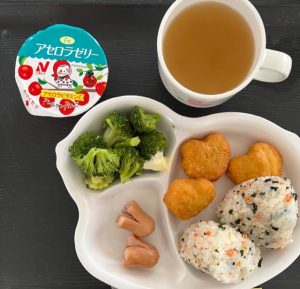 おにぎり・ナゲット・ウインナー・ブロッコリー・コンソメスープ・アセロラゼリー