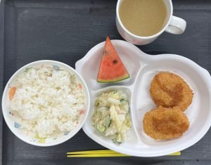 ごはん・コロッケ・コールスローサラダ・みそ汁・スイカ