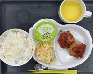 ごはん・手作りハンバーグ・パスタサラダ・コーンスープ・ゼリー
