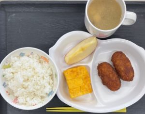 ごはん・甘辛チキンカツ・厚焼き玉子・みそ汁・りんご