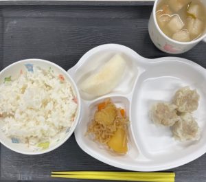 ごはん・肉じゃが・シュウマイ・みそ汁・梨