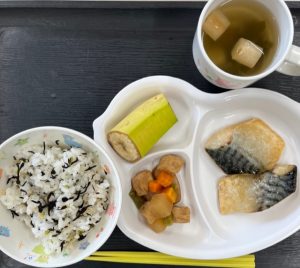 ひじきごはん・サバの味噌煮・厚揚げの煮物・すまし汁・バナナ