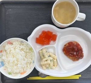 ごはん・手作りハンバーグ・マカロニサラダ・みそ汁・ゼリー