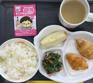 ごはん・ふりかけ・白身魚フライ・胡麻和え・みそ汁・りんご