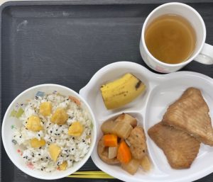 栗ご飯・魚の照り焼き・がんも煮・みそ汁・バナナ